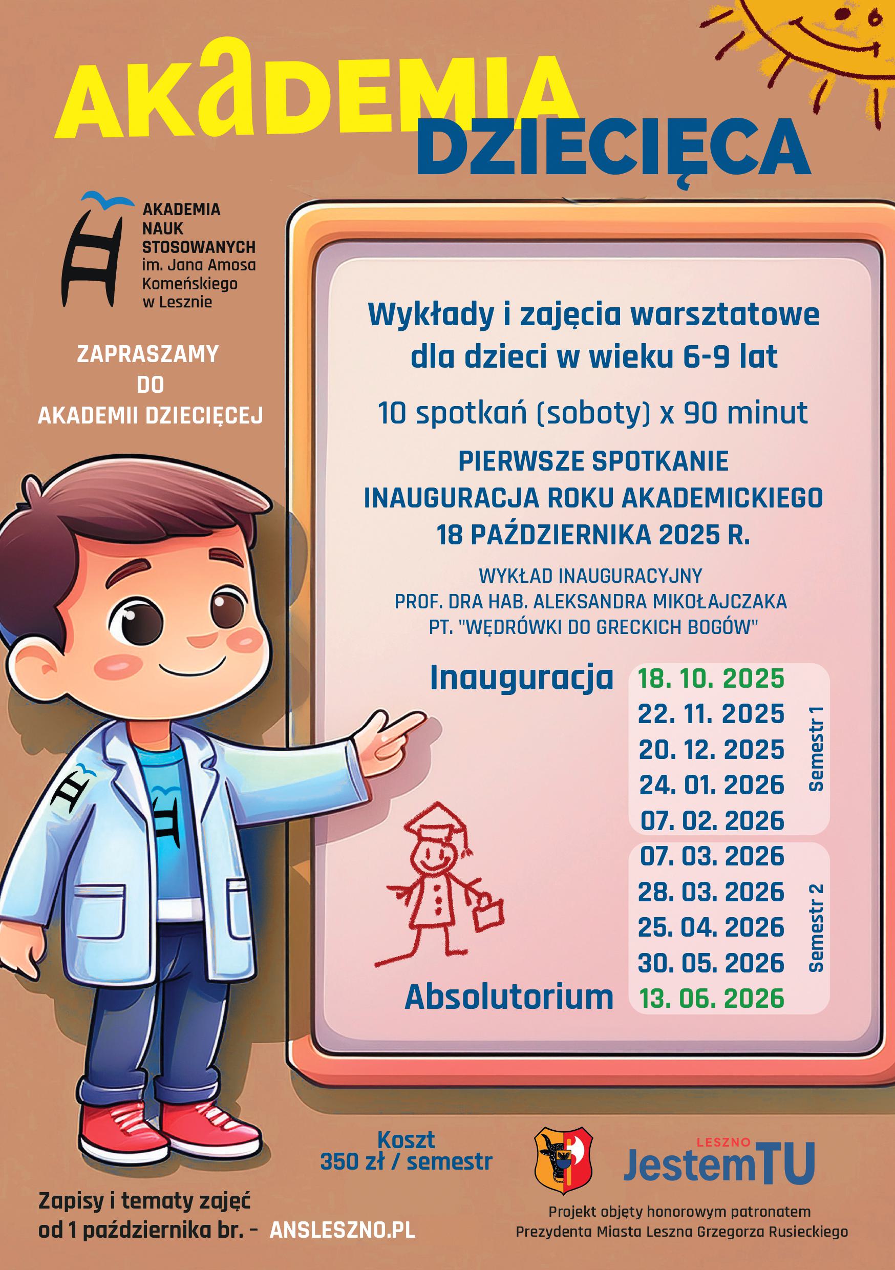 Już w październiku rusza pierwsza edycja Akademii Dziecięcej w Akademii Nauk Stosowanych im. Jana Amosa Komeńskiego w Lesznie. To nowatorski projekt edukacyjny dla dzieci w wieku 6–9 lat, którego celem jest rozbudzanie ciekawości świata i rozwijanie kreatywności poprzez naukę w atrakcyjnej formie.