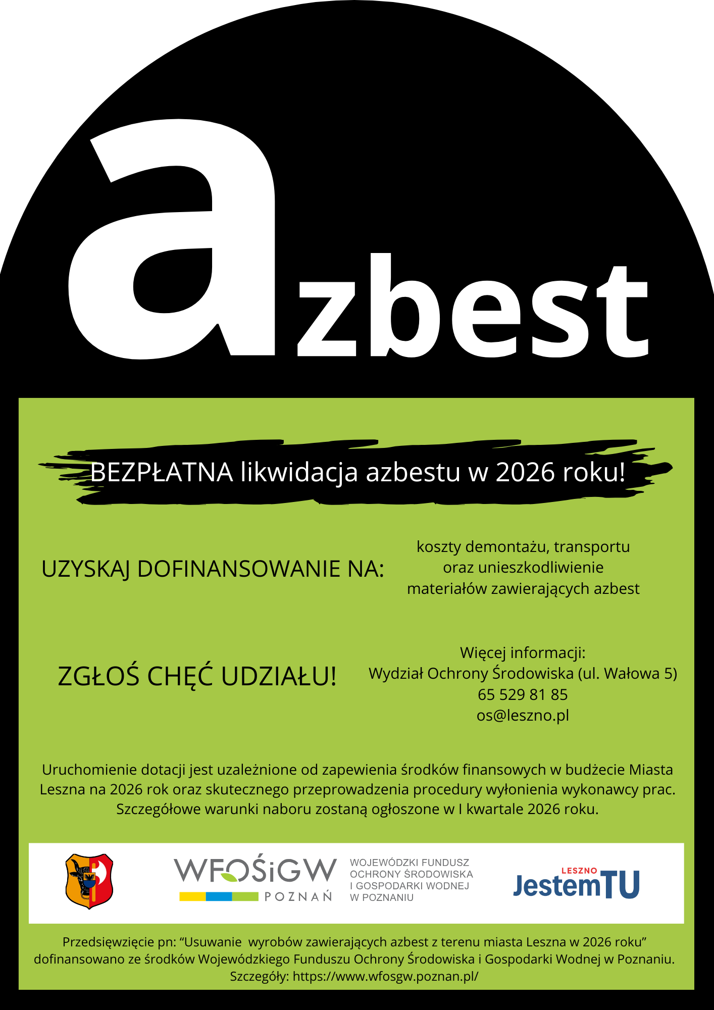 Przedsięwzięcie pn.: "Usuwanie wyrobów zawierających azbest z terenu miasta Leszna w 2026 roku" dofinansowano ze środków Wojewódzkiego Funduszu Ochrony Środowiska i Gospodarki Wodnej w poznaniu w formie dotacji do kwoty ogółem 21 120,00 zł. Szczegółowe informacje można uzyskać na stronie: https://www.wfosgw.poznan.pl/