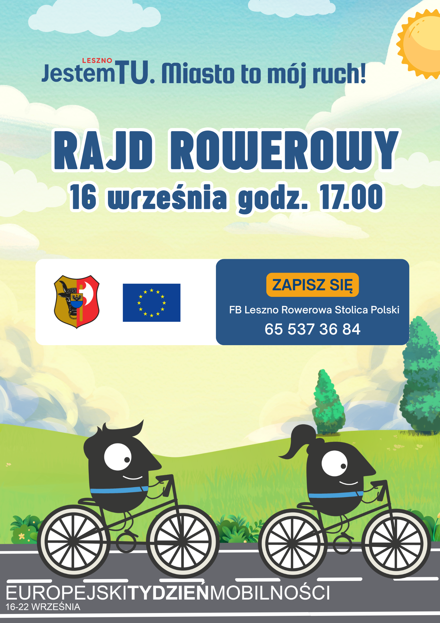 W dniach 16-22 września zapraszamy mieszkańców do kilku aktywności. Europejski Tydzień mobilności w Lesznie rozpocznie się od Rajdu Rowerowego „Jestem tu. Miasto to mój ruch”, który odbędzie się 16 września (wtorek) o godz. 17.00. W rajdzie weźmie udział Prezydent Miasta Leszna Grzegorz Rusiecki. Wydarzenie będzie doskonałą okazją do wspólnej, aktywnej przejażdżki po krótkiej trasie wokół miasta. Miejsce startu zostanie podane po dokonaniu rejestracji. O bezpieczeństwo zadbają rowerzyści ze Stowarzyszenia Turystyki Rowerowej „Dynamo" z Wilkowic. Zapisy: na profilu facebookowym Leszno - Rowerowa Stolica Polski i pod numerem telefonu 65 537 36 84. Liczba miejsc jest ograniczona. Szczegółowych informacji udziela Wydział Promocji i Rozwoju UML.
