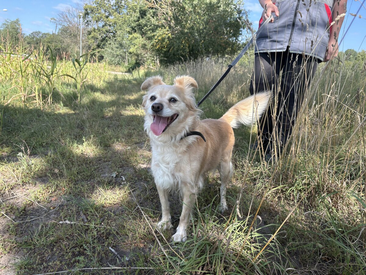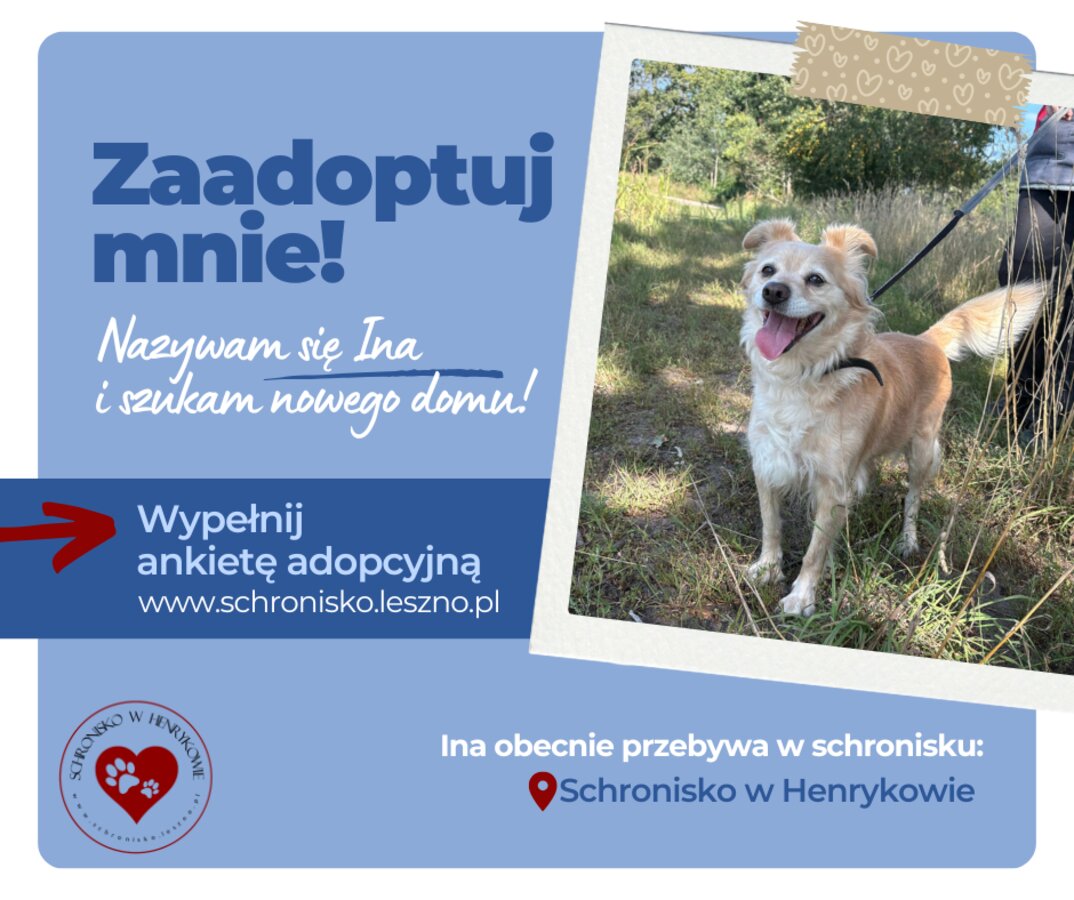 Ina to prawdziwy promyk słońca na czterech łapach. Trafiła do Schroniska po 12 latach przebywania w domku. Zawsze uśmiechnięta, pogodna i otwarta na ludzi – nie sposób jej nie pokochać! Jest niesamowicie przyjazna, lgnie do człowieka, uwielbia być głaskana, przytulana, blisko – bo właśnie w kontakcie z człowiekiem czuje się najlepiej.