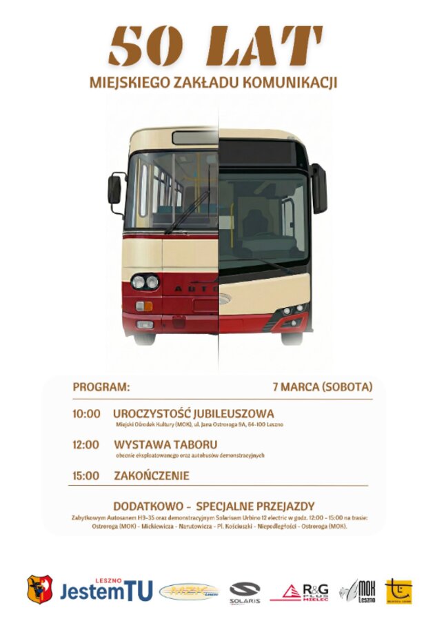 Serdecznie zapraszamy wszystkich mieszkańców, sympatyków komunikacji miejskiej oraz całe rodziny do wspólnego świętowania. Pokażmy, że transport publiczny od 50 lat jest nieodłącznym elementem bijącego serca Leszna.