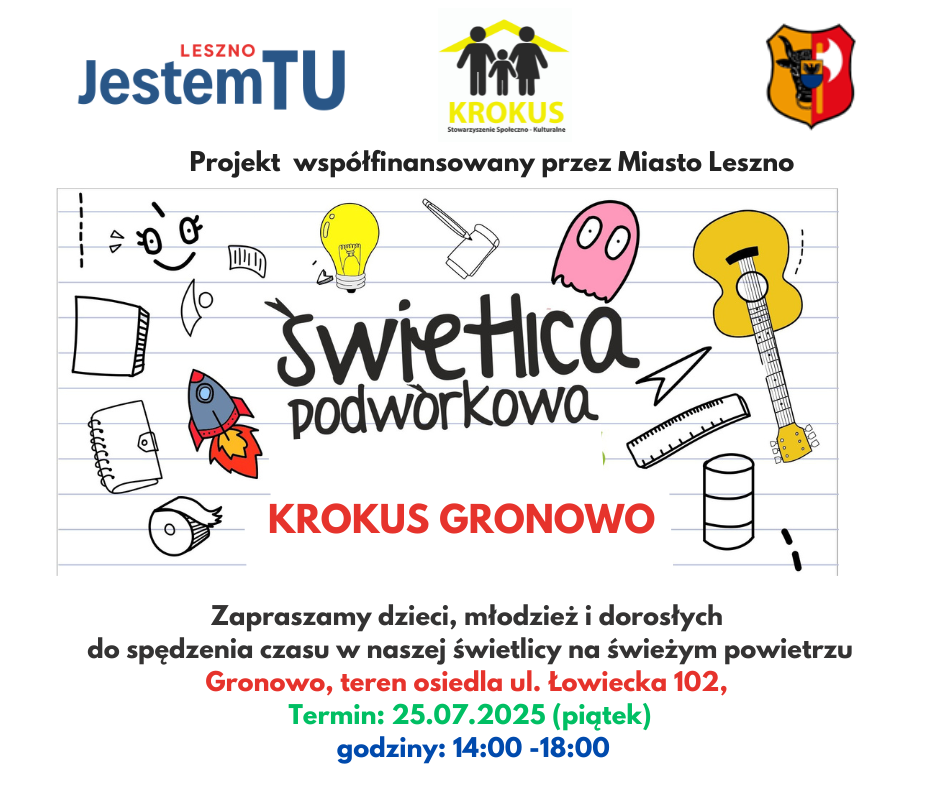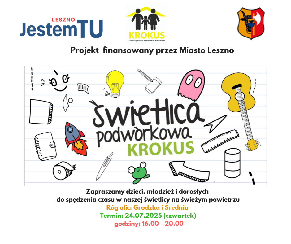 Zapraszamy wszystkich do udziału w projekcie Świetlica Podwórkowa KROKUS. Projekt jest realizowany od 10 lipca 2025 do 31 grudnia 2025 na terenie Miasta Leszna. W ramach realizacji projektu przeprowadzimy m.in. w okresie letnim 10 zajęć/warsztatów namiotowych w Świetlicy Podwórkowej KROKUS. Udział w zajęciach jest bezpłatny dla uczestników.