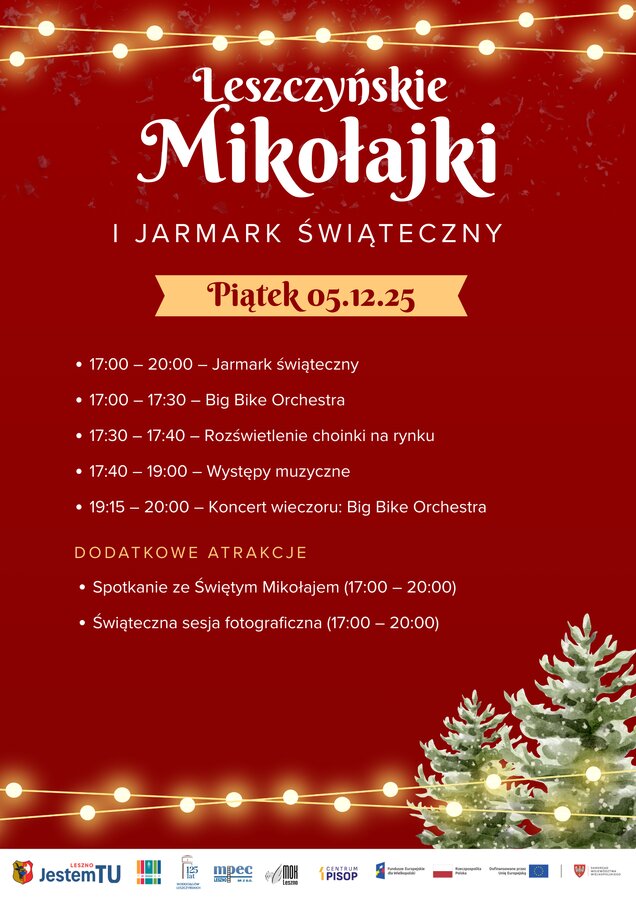 Wydarzenie rozpocznie się w piątek, o godz. 17:00 uroczystym otwarciem jarmarku. Towarzyszyć temu będzie występ „Big Bike Orchestra”, a chwilę później, przy wspólnym odliczaniu z Prezydentem Miasta Leszna, Grzegorzem Rusieckim, rozbłyśnie świąteczna choinka.