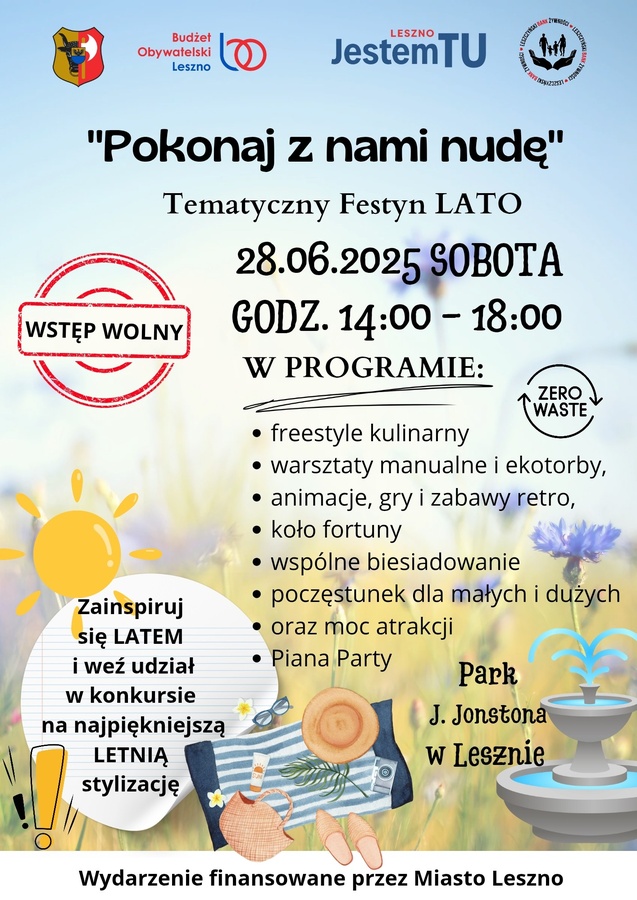 Już w najbliższą sobotę 28 czerwca 2025 w Parku Jonstona po stronie fontanny, kolejny Festyn Tematyczny w ramach Budżet Obywatelski Leszno pt.:"LATO"