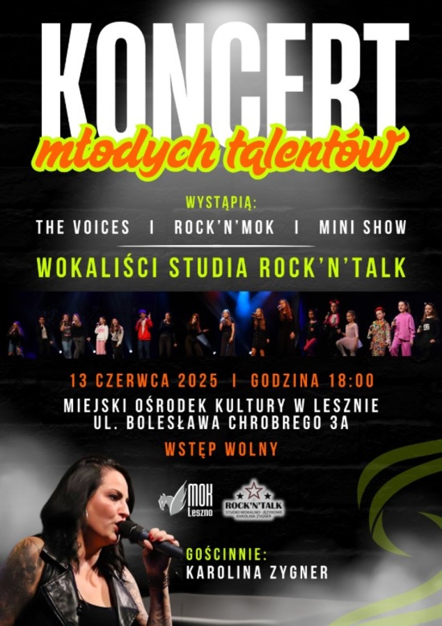 Serdecznie zapraszamy na wyjątkowy, wzruszający, nasycony emocjami wieczór! Już 13 czerwca br. o godzinie 18:00 w sali Miejskiego Ośrodka Kultury w Lesznie usłyszycie piekielnie zdolnych członków sekcji wokalnej MOK, czyli zespoły: The Voices, Rock'n'MOK, Mini Show oraz równie niesamowicie śpiewające dzieciaki z Rock'n'talk. Studio wokalno-językowe. Karolina Zygner. Koncert Młodych Talentów to podsumowanie pracy, jaką przez mijający sezon wykonali artyści rozwijający się pod skrzydłami Karolina Zygner, która jest jednocześnie wokalistką zespołu Simply Flow i gościnnie również wystąpi podczas tego wydarzenia. Jej obecność na scenie to ogromna inspiracja dla wszystkich zaangażowanych i pełnych pasji uczestników. Przyjdźcie całymi rodzinami, by wesprzeć i podziwiać ich umiejętności, energię, a także pobawić się przy wyjątkowych interpretacjach znanych i uwielbianych utworów!