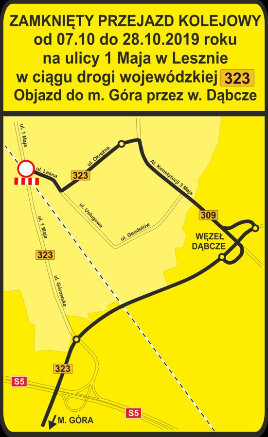 W związku z powyższym zachowany zostaje obowiązujący objazd, który jest poprowadzony drogą wojewódzką 323 (ul. Leśną i Okrężną), następnie Al. Konstytucji 3 Maja przez węzeł „Dąbcze” do drogi wojewódzkiej 323 w kierunku Góry.