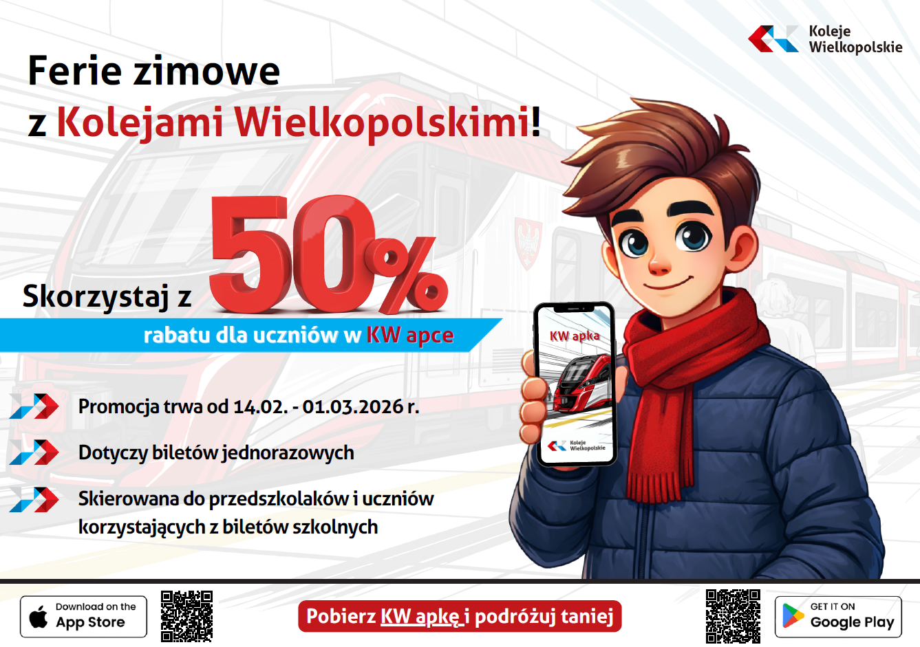 Koleje Wielkopolskie ruszają z akcją promocyjną na ferie zimowe. Dzieci i uczniowie mogą skorzystać z 50% zniżki na bilety w KW apce. Szczegóły i zasady promocji znajdują się na plakacie w załączniku.