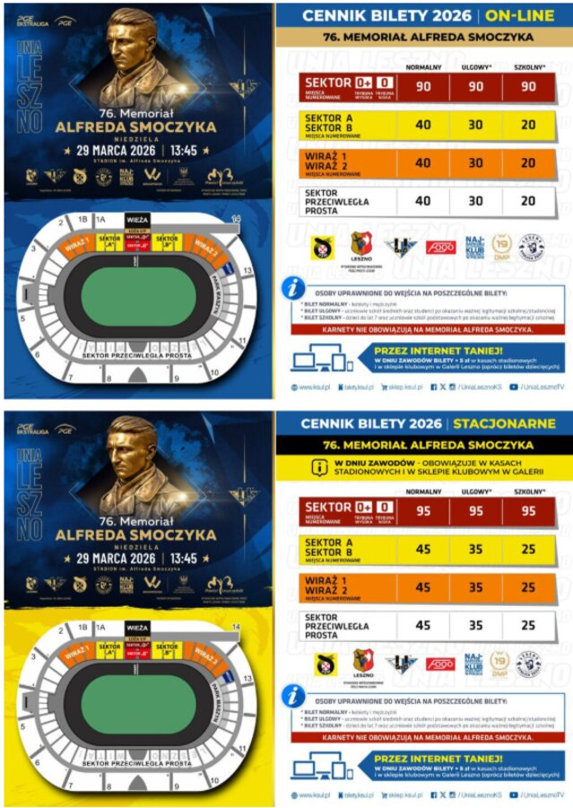 29 marca (niedziela) o godzinie 13:45 rozpocznie się 76. Memoriał Alfreda Smoczyka. Poniżej prezentujemy listę startową oraz ceny biletów na to wydarzenie. Przypominamy, że KARNETY NIE OBOWIĄZUJĄ NA MEMORIAŁ ALFREDA SMOCZYKA!