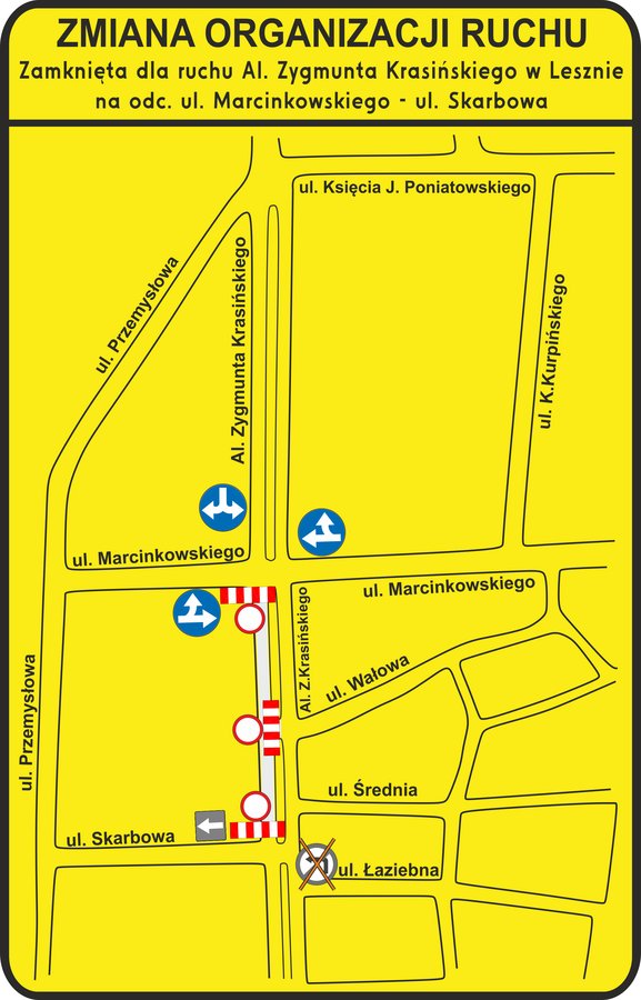 Urząd Miasta Leszna, Miejski Zarząd Dróg informuje, że w dniach 26.10-03.11.2020r. zamknięta dla ruchu będzie Al. Zygmunta Krasińskiego na odcinku od ul. Marcinkowskiego do ul. Skarbowej w Lesznie. Dojazd do ul. Skarbowej będzie możliwy od strony skrzyżowania Al. Zygmunta Krasińskiego z ul. Łaziebną, zaś kierujący jadący w kierunku Al. Jana Pawła II i pl. Jana Metziga powinni korzystać z równoległej ul. Przemysłowej.
