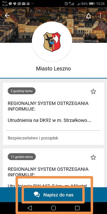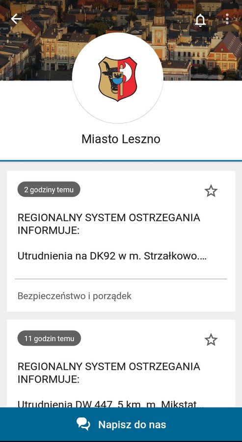 Co ważne aplikacja pozwala także na kontakt mieszkańców z urzędem. Po wybraniu ikonki „Miasto Leszno” oprócz komunikatów pojawia się także opcja „Napisz do nas”. To wygodna forma, by zgłosić napotkany problem. Wystarczy krótko opisać co się stało, co zauważyliśmy, a co wymaga naprawy, czy interwencji miejskich służb i jednym kliknięciem wysłać taką wiadomość. Pamiętajmy, aby podawać adres miejsca, w którym napotkaliśmy problem czy usterkę. Ułatwi to jej lokalizację miejskim służbom. Warto też dołączyć zdjęcie – aplikacja daje taką możliwość.