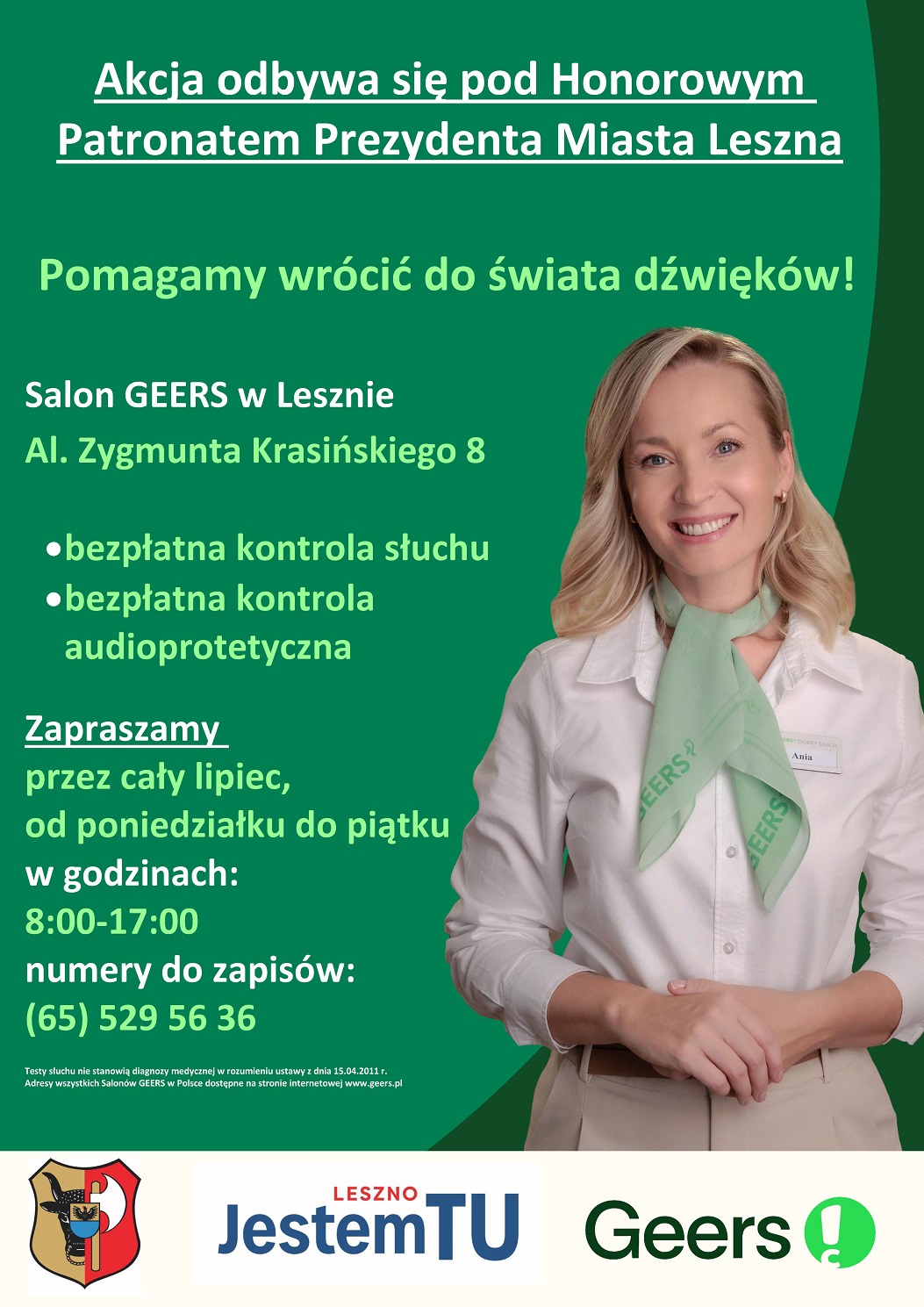 Salon Geers w Lesznie zaprasza przez cały miesiąc lipiec do korzystania z bezpłatnego badania słuchu. Akcja odbywa się pod Honorowym Patronatem Prezydenta Miasta Leszna!
