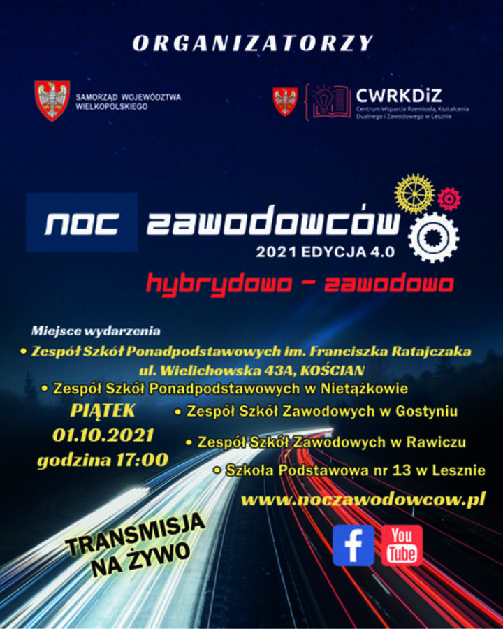 - godz. 17.00, online Leszno/Kościan/Rawicz/Gostyń, Noc Zawodowców 2021 edycja 4.0 HYBRYDOWO-ZAWODOWO, więcej szczegółów: https://leszno.pl/NOC_ZAWODOWCOW_2021_edycja_4_0_HYBRYDOWO-ZAWODOWO_3aaa9.html