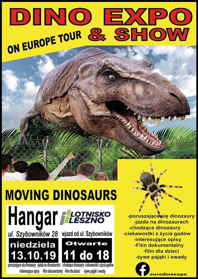 - godz. 11:00, Lotnisko Leszno Hangar, ul. Szybowników 28, Leszno Dino Expo podróżnicza wystawa dinozaurów żywe pająki Leszno Lotnisko Leszno Hangar, ul. Szybowników 28 https://leszno.pl/Leszno_Dino_Expo_podroznicza_wystawa_dinozaurow_zywe_pajaki.html