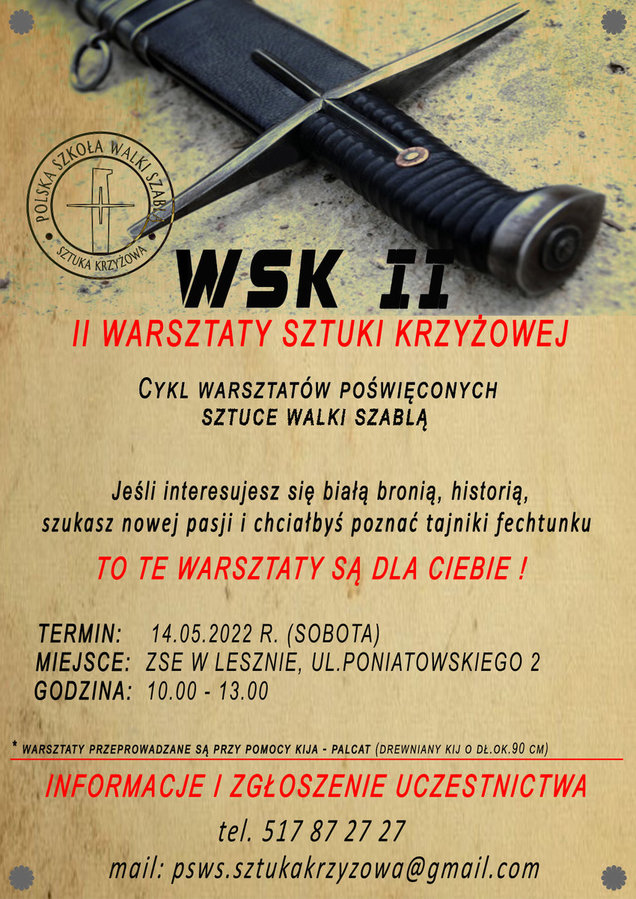 godz. 10.00, Zespół Szkół Ekonomicznych w Lesznie, II Warsztaty Sztuki Krzyżowej - SZERMIERKI SZABLĄ; więcej informacji znajdziesz na: https://leszno.pl/II_Warsztaty_Sztuki_Krzyzowej_-_SZERMIERKI_SZABLA_f7436.html