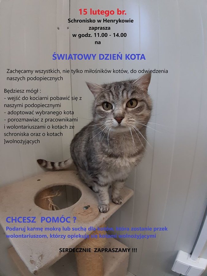 - godz. 11.00, Schronisko w Henrykowie, Światowy Dzień Kota; szczegóły: https://leszno.pl/Swiatowy_Dzien_Kota.html