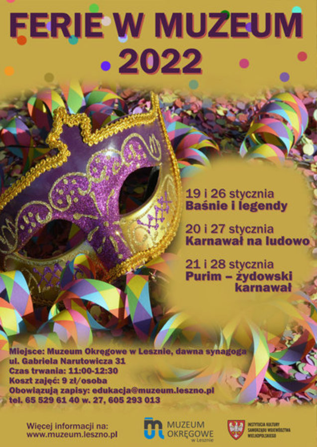 godz. 11.00, Muzeum Okręgowe w Lesznie, Ferie w Muzeum, Muzeum Okręgowe w Lesznie, dawna synagoga, ul. G. Narutowicza 31, Purim – żydowski karnawał, obowiązują zapisy, więcej szczegółów na: https://leszno.pl/Ferie_w_Muzeum_3d034.html