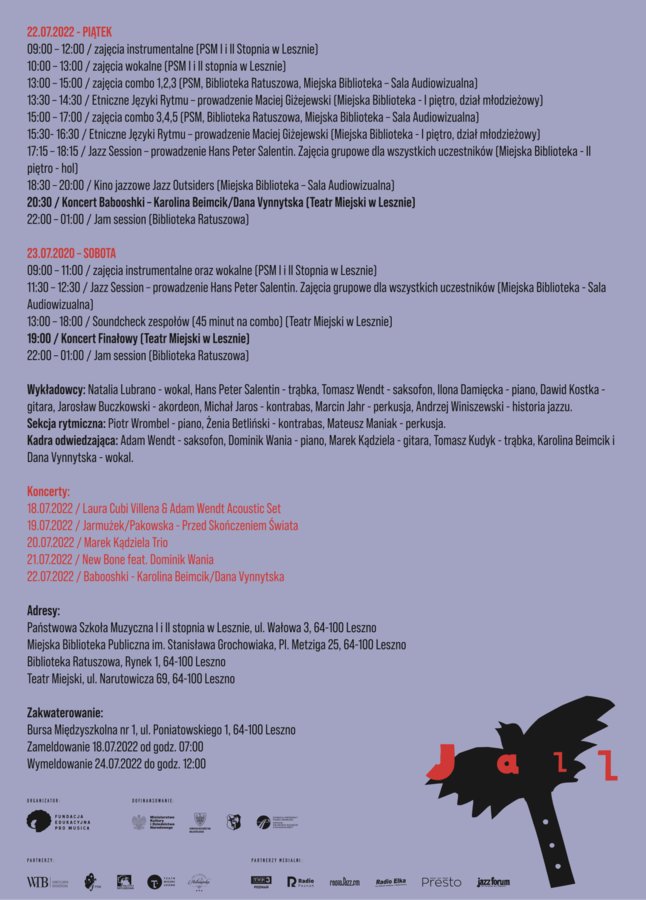 - godz. 19:00, Teatr Miejski w Lesznie, Koncert Finałowy w Lesznie, 18. Międzynarodowe Warsztaty Jazzowe; więcej informacji znajdziesz na: https://leszno.pl/18__Miedzynarodowe_Warsztaty_Jazzowe.html