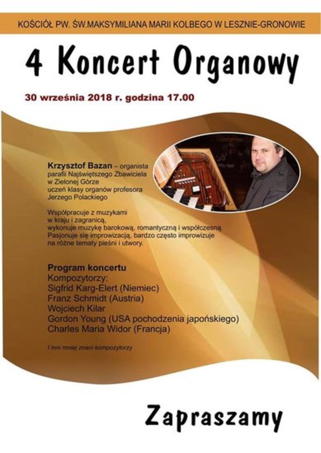 - godz. 17:00, Kościół p.w. Św. Maksymiliana Marii Kolbego, 4 Koncert Organowy; szczegóły: https://leszno.pl/4_Koncert_Organowy.html