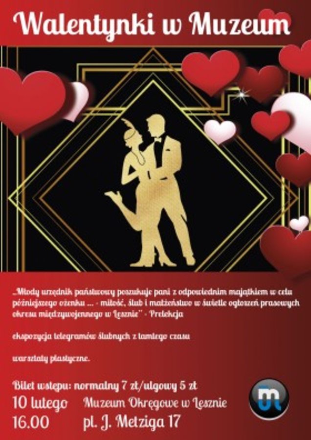 - godz. 16.00, Budynek główny Muzeum, pl. J. Metziga 17, Walentynki w Muzeum; szczegóły: https://leszno.pl/Walentynki_w_Muzeum.html