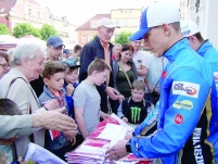 2 maja, Dzień Flagi. Na Rynku w Lesznie flagi biało-czerwone rozdawali żużlowcy Fogo Unii Leszno oraz prezydent i wiceprezydenci miasta.