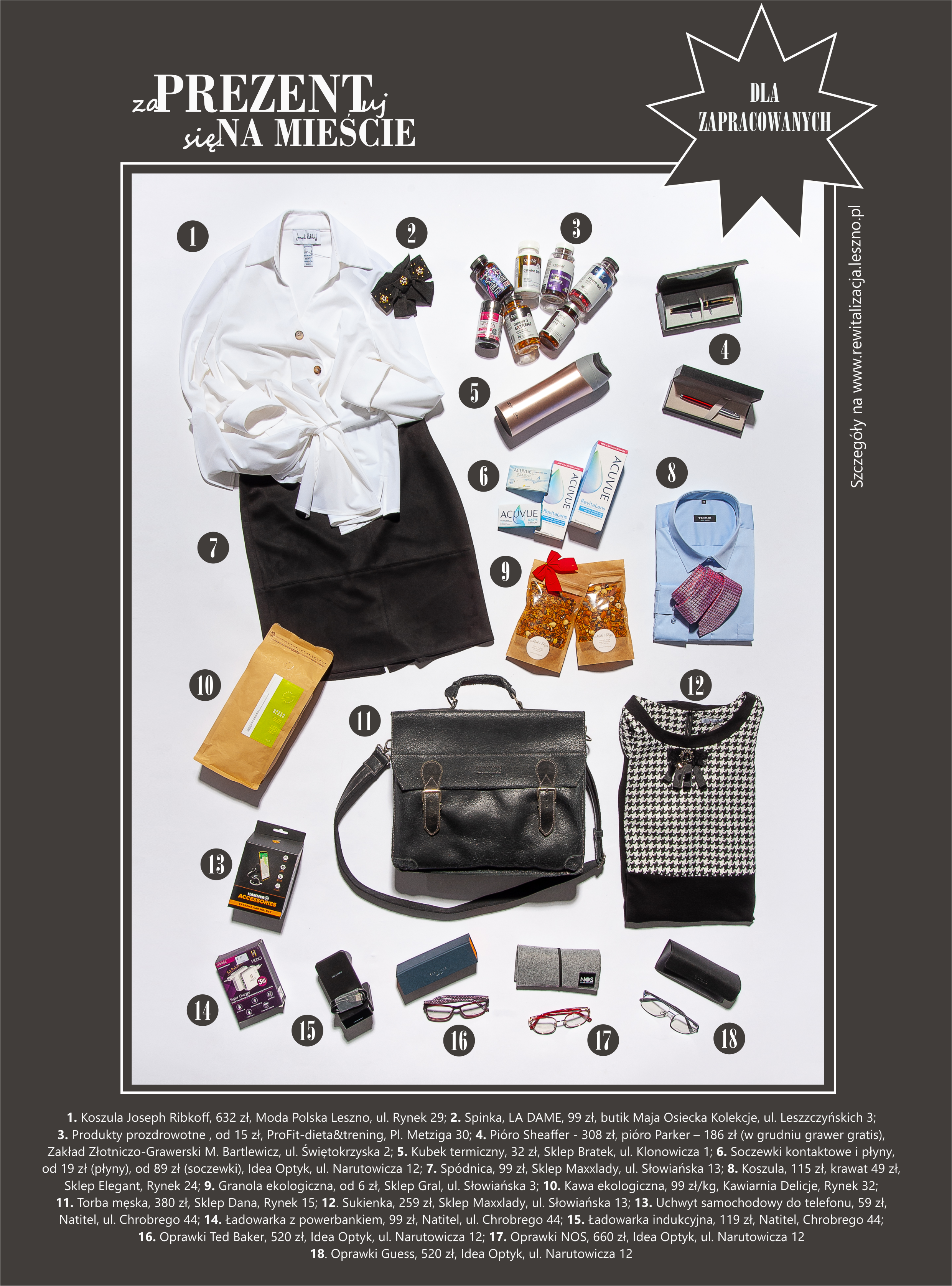 Żyją w nieustannym biegu i pośpiechu. Całe dni spędzają przed komputerem, rzadko myśląc o sobie. Znacie takie osoby? Teraz możecie trochę o nie zadbać! Odpowiednio dobrany zestaw suplementów diety, granola na zdrowe i szybkie śniadania oraz kubek termiczny, by w końcu móc wypić kawę, zanim zdąży ostygnąć. Dla zapracowanych zawsze sprawdzi się także stylowe pióro, elegancka koszula czy sweterek, a także dodatki jak skórzana torba czy designerskie okulary.