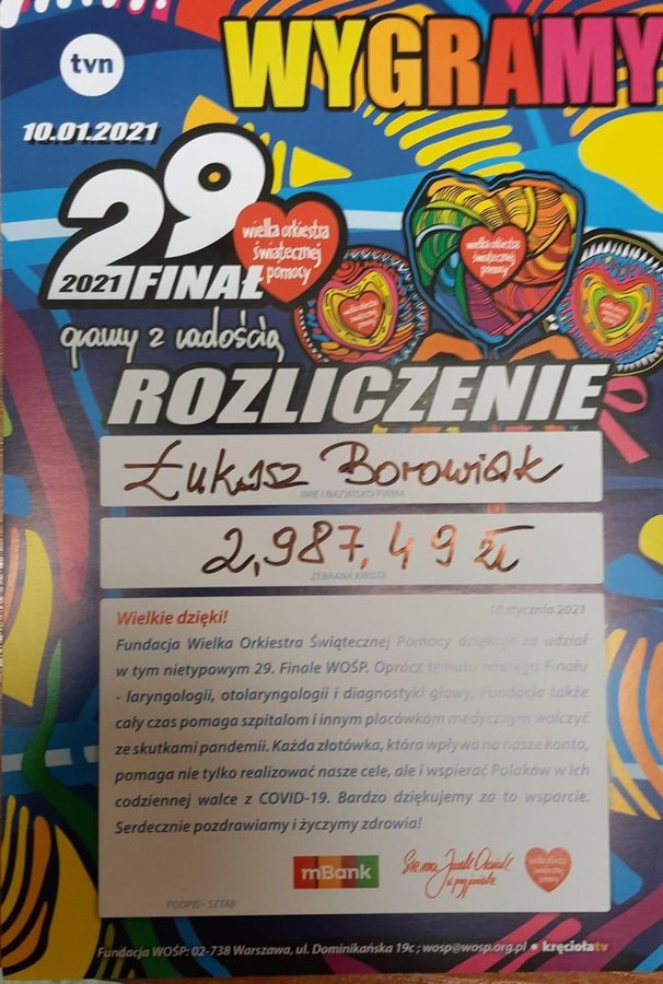 Wielka Orkiestra Świątecznej Pomocy „gra” dla Polaków już od 29 lat. To piękny jubileusz. Ale nie byłoby go, gdyby nie WY.Pragnę serdeczne podziękować za Państwa pracę, olbrzymie zaangażowanie, czasem może nawet poświęcenie. Państwa niesłabnący entuzjazm, doskonała organizacja i godna naśladowania bezinteresowność są gwarantem powodzenia fenomenu jakim jest Wielka Orkiestra Świątecznej Pomocy. Doskonale zdaję sobie sprawę z tego, że Państwa działania zaczynają się dużo wcześniej niż Finał WOŚP, i że trwają jeszcze długo po tym, jak wybrzmi ostatni akord tego wyjątkowego dnia. Za każdy z tych dni dziękuję.