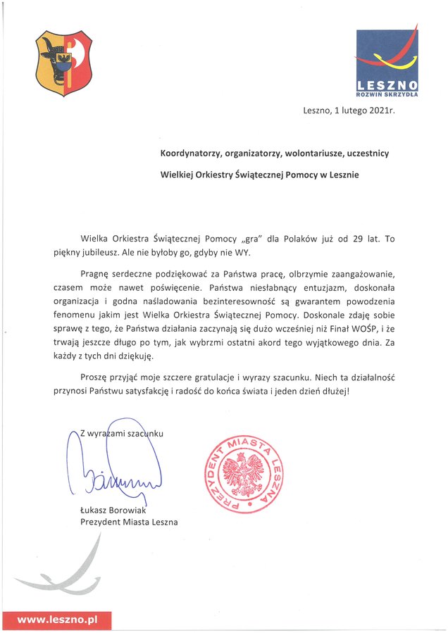 A oto podziękowania Prezydenta Miasta Leszna dla wszystkich zaangażowanych w Wielką Orkiestrę.
