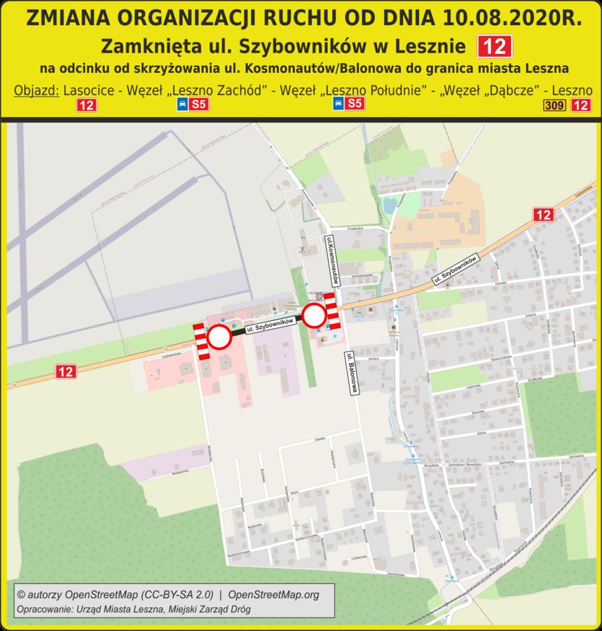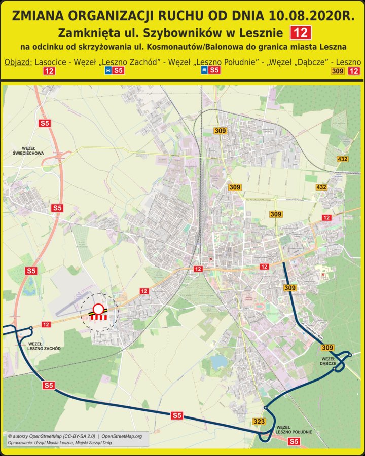 Zalecany objazd wyznaczono przez: Lasocice (DK12) - Węzeł "Leszno Zachód" (S5) - Węzeł "Leszno Południe" (S5) - Węzeł "Dąbcze" - Leszno (309) (DK12).