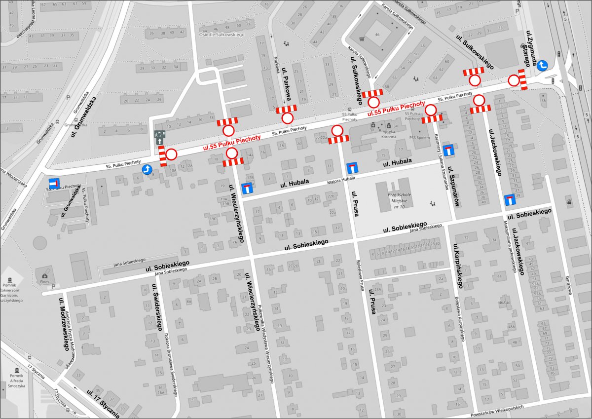 Oznacza to, że z ruchu samochodowego wyłączone zostanie skrzyżowanie tej ulicy z ul. Wiecierzyńskiego. Wjeżdżając w ul. 55 Pułku Piechoty z ul. Grunwaldzkiej będzie można tylko skręcić w lewo, w osiedle bloków Leszczyńskiej Spółdzielni Mieszkaniowej.