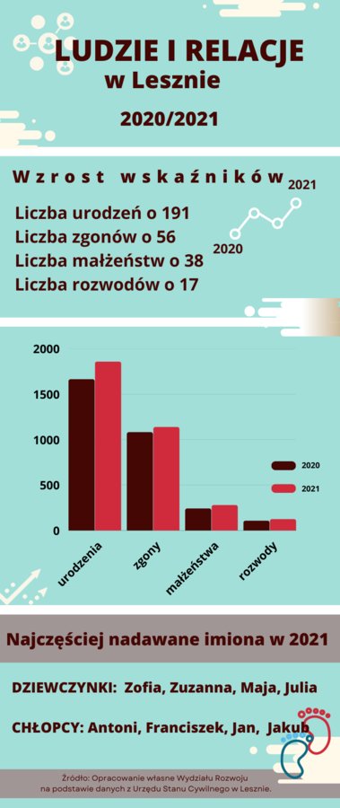 W 2021 roku sporządzono ogółem 1857 aktów urodzeń, w tym 75 to zagraniczne akty urodzenia wpisane do polskich ksiąg stanu cywilnego, natomiast w 2020 r. zarejestrowano takich dokumentów 1663, gdzie zagranicznych wpisów było 72.