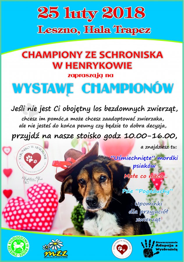 Dzięki uprzejmości przyjaciół ze Związku Kynologicznego, psy ze schroniska w Henrykowie po raz kolejny mogą uczestniczyć w wystawie Championów, która odbędzie się 25 lutego br. (niedziela) na Hali Trapez w godz. od 10.00 do 16.00.