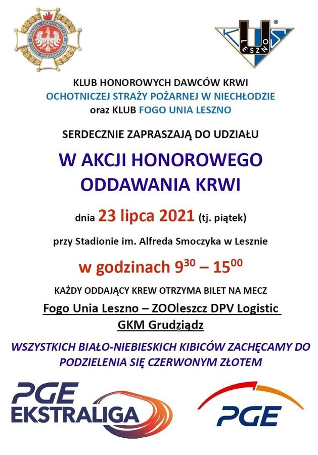 Każdy oddawający krew otrzyma bilet na mecz Fogo Unia Leszno- ZOOleszcz DPV Logistic GKM Grudziądz.