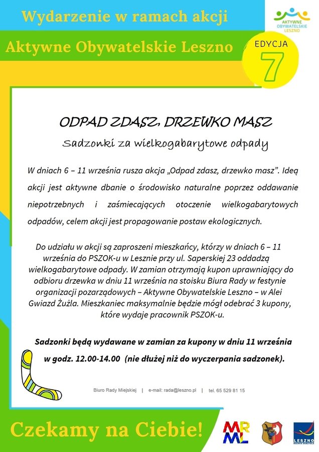 Do udziału w akcji są zaproszeni mieszkańcy, którzy w dniach 6 – 11 września do PSZOK-u w Lesznie przy ul. Saperskiej 23 oddadzą wielkogabarytowe odpady. W zamian otrzymają kupon uprawniający do odbioru drzewka w dniu 11 września na stoisku Biura Rady w festynie organizacji pozarządowych – Aktywne Obywatelskie Leszno – w Alei Gwiazd Żużla. Mieszkaniec maksymalnie będzie mógł odebrać 3 kupony, które wydaje pracownik PSZOK-u.