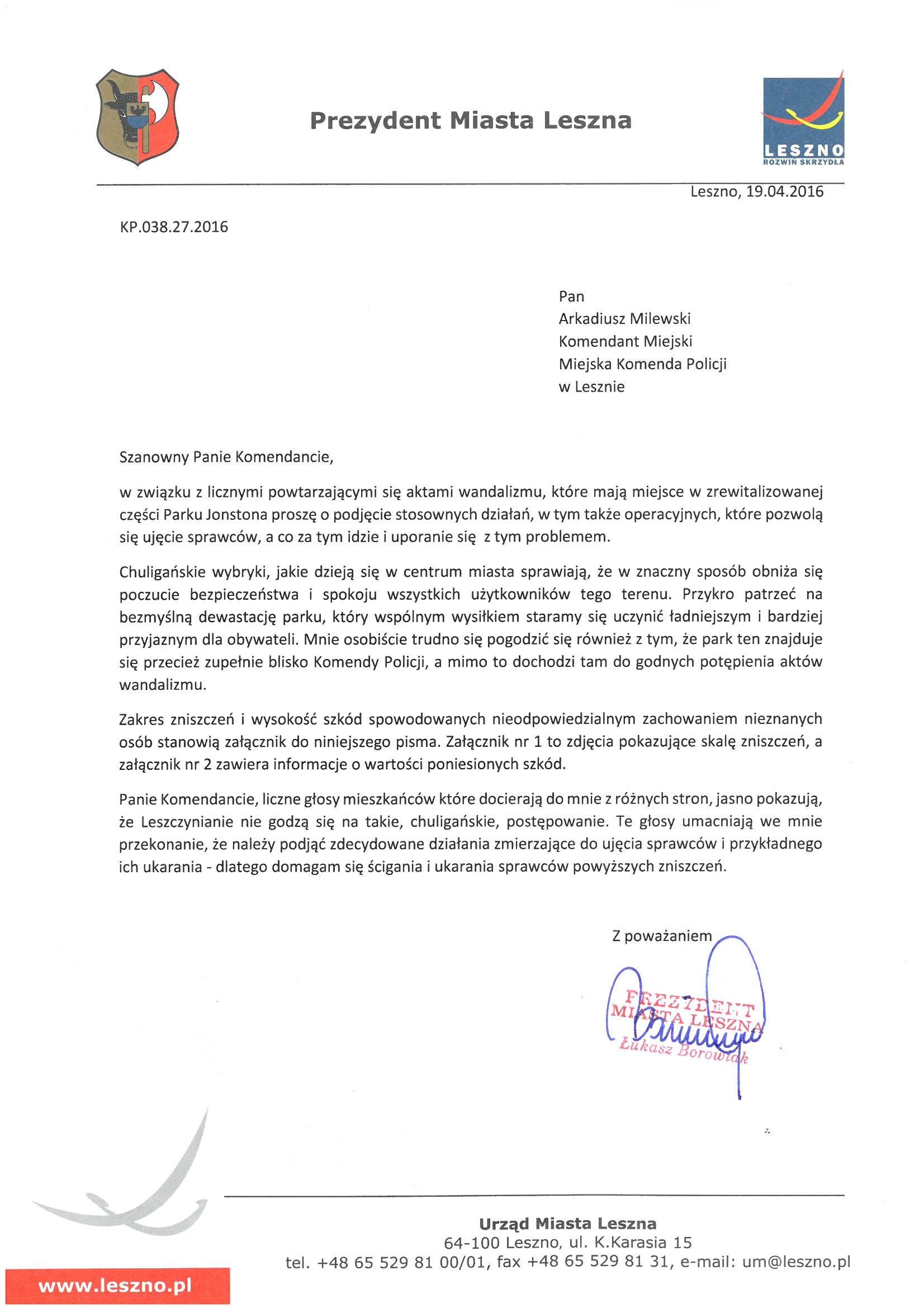 Po kolejnych zniszczeniach w Parku Jonstona, Prezydent Łukasz Borowiak skierował oficjalne pismo do Policji. Domaga się w nim podjęcia stanowczych działań i wykrycia sprawców.