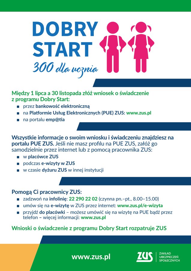 Świadczenie z programu Dobry Start będzie wypłacane wyłącznie na rachunek bankowy, który wskaże wnioskodawca we wniosku. Wszystkie informacje o swoim wniosku i świadczeniu znajdują się na portalu PUE ZUS. Obsługą świadczeń od tego roku zajmuje się ZUS. Wnioski można składać od 1 lipca do 30 listopada 2021 r.