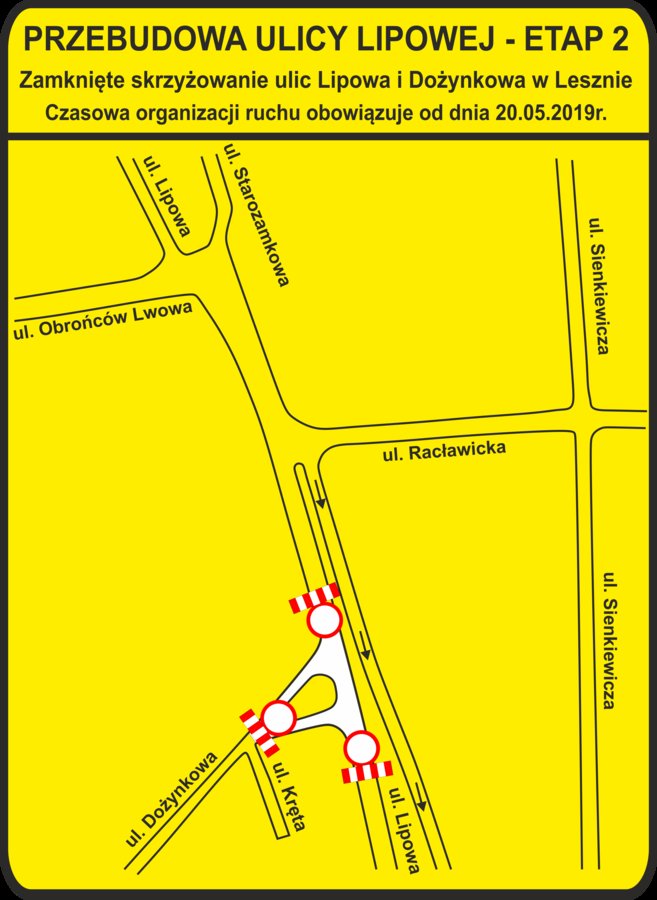 Nadto Miejski Zakład Komunikacji w Lesznie informuje, że autobusy linii nr 1, nr 2, nr 5 będą korzystały z objazdu ulicą Chociszewskiego do ulicy Obrońców Lwowa. Przystanek zastępczy dla przystanku Lipowa MPWiK został usytuowany przy ulicy Kanałowej - dotyczy linii nr 1 i nr 2. Przystanek zastępczy dla przystanku Lipowa market został usytuowany przy ulicy Obrońców Lwowa na wysokości marketu "Lidl" - dotyczy linii nr 1, nr 2, nr 5.