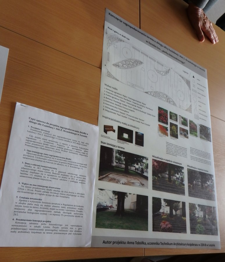 Dyrektor ZSR-B w Lesznie Franciszek Kaczmarek,Dyrektor MZZ w Lesznie Dariusz Lorych, Architekt Miejski Maciej Kubiak, Miejski Konserwator Zabytków Maciej Urban oraz przy udziale: przedstawiciela biura prasowego Prezydenta Miasta Leszna Bernadety Klupś, przedstawiciela ZSR-B w Lesznie Edyty Starkbauer, przedstawiciela ZSR-B w Lesznie Natalii Grobelnej wyłoniono zwycięzców konkursu na zagospodarowanie terenu u zbiegu ulicy Łaziebnej i Alei Z. Krasińskiego w Lesznie w formie tzw. „parku kieszonkowego”.