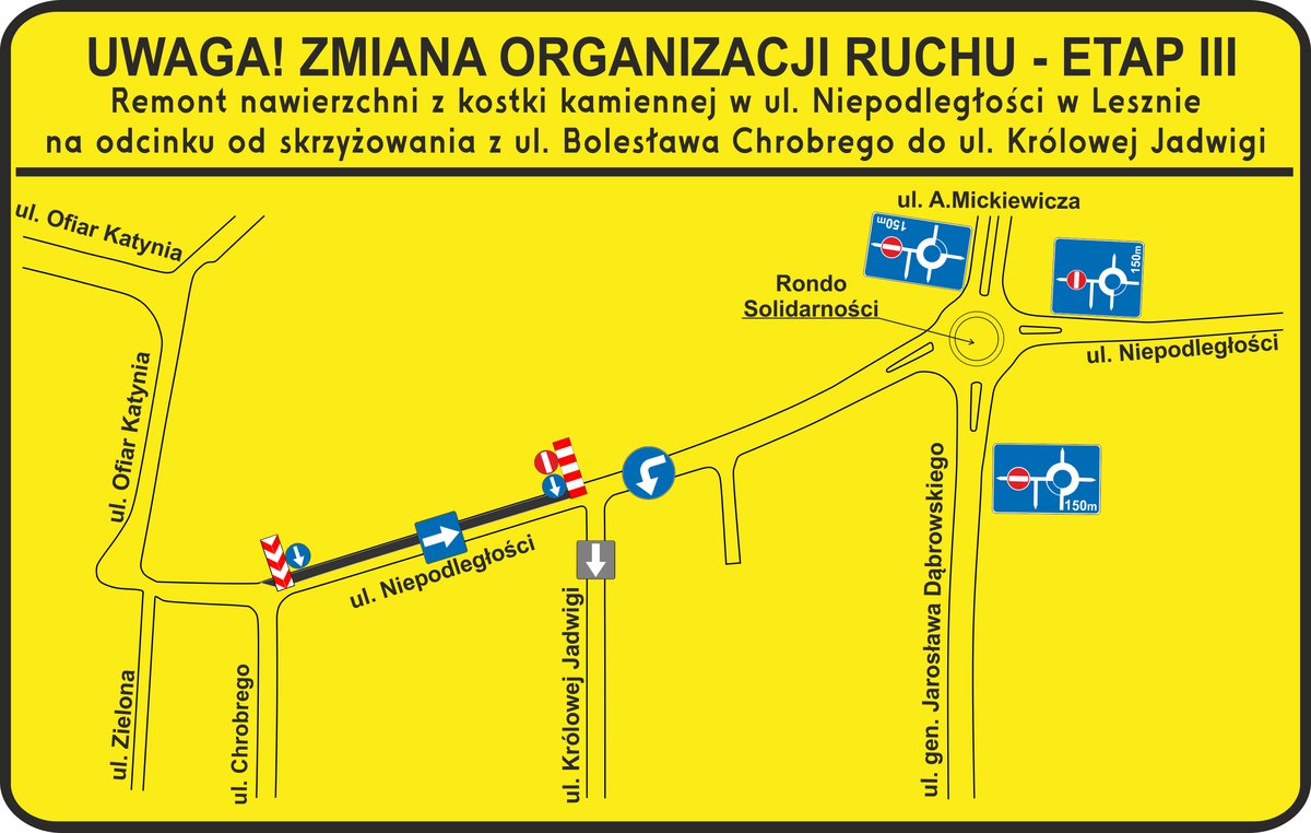 W związku z trwającymi pracami drogowymi polegającymi na remoncie nawierzchni z kostki nieregularnej w ul. Niepodległości w dalszym ciągu obowiązuje na odcinku od ul. Bolesława Chrobrego do ul. Królowej Jadwigi (bez skrzyżowań) jednokierunkowy ruch pojazdów w kierunku Ronda Solidarności.