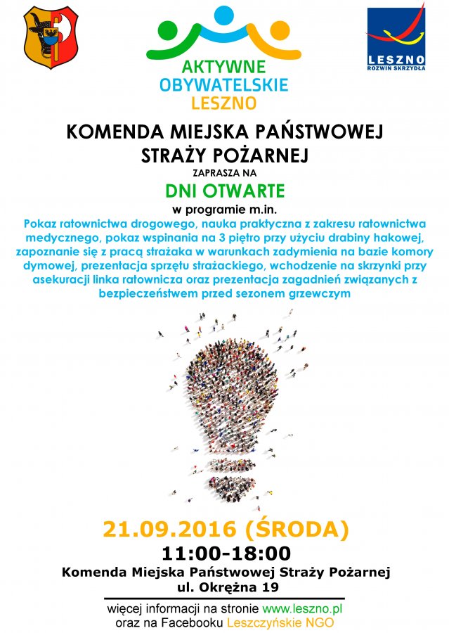 Środa 21 września będzie już trzecim dniem pełnym atrakcji przygotowanych przez leszczyńskie organizacje pozarządowe i instytucje. Część z nich będzie okazją do nadrobienia wcześniej ominiętych wydarzeń. W Komendzie Miejskiej Państwowej Straży Pożarnej w Lesznie po raz kolejny będzie można podziwiać strażaków w akcji, czy sprawdzić jak to jest przebywać w warunkach zadymienia – oczywiście pod kontrolą w specjalnie do tego przeznaczonej komorze. Oczywiście to tylko niektóre z proponowanych atrakcji.