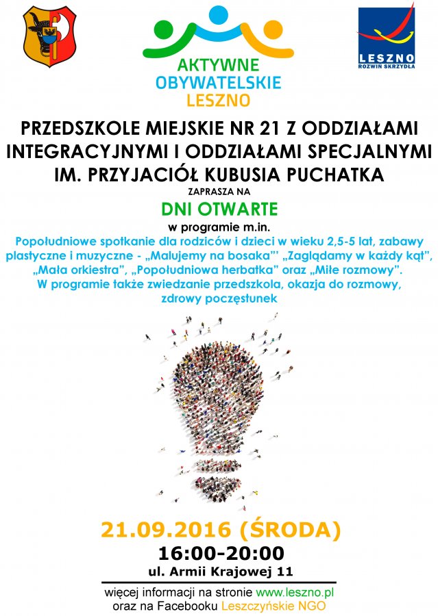 Dni otwarte w tym dniu proponuje również Przedszkole Miejskie nr 21 z Oddziałami Integracyjnymi i Oddziałami Specjalnymi im. Przyjaciół Kubusia Puchatka, które zaprasza rodziców wraz z dziećmi w wieku 2,5 do 5 lat na popołudniowe spotkanie wypełnione wspólnymi zabawami oraz zwiedzaniem przedszkola. „Malujemy na bosaka”, „Mała orkiestra” czy „Zaglądamy w każdy kąt” brzmi z pewnością zachęcająco.