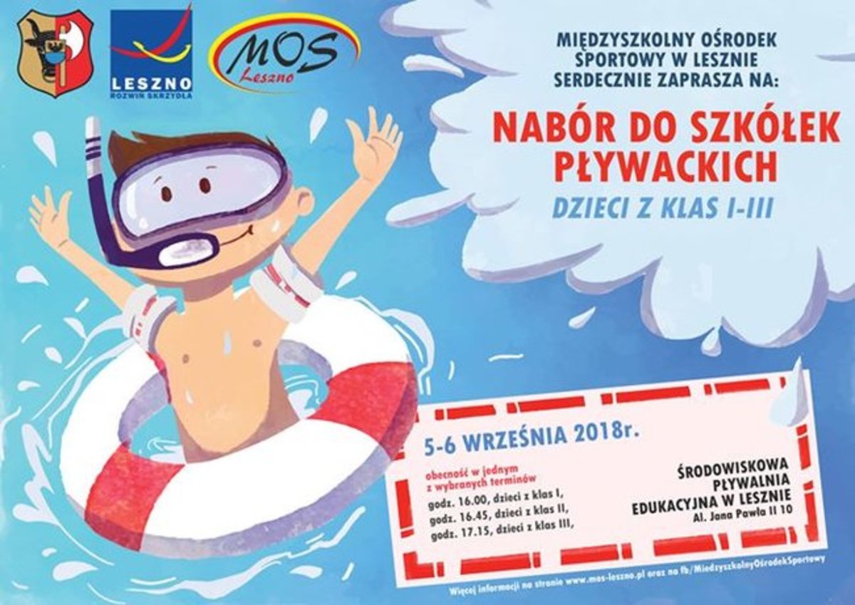 Chętni do szkółek pływackich powinni się zgłosić na test do Środowiskowej Pływalni Edukacyjnej. Do wyboru są dwa terminy - 5 i 6 września. Próba dla uczniów klas I zacznie się o godz. 16, drugoklasistów o godz. 16:45, a uczniów klas III o godz. 17:15. Pierwszeństwo przyjęcia do szkółki pływackiej będą miały dzieci zameldowane w Lesznie.