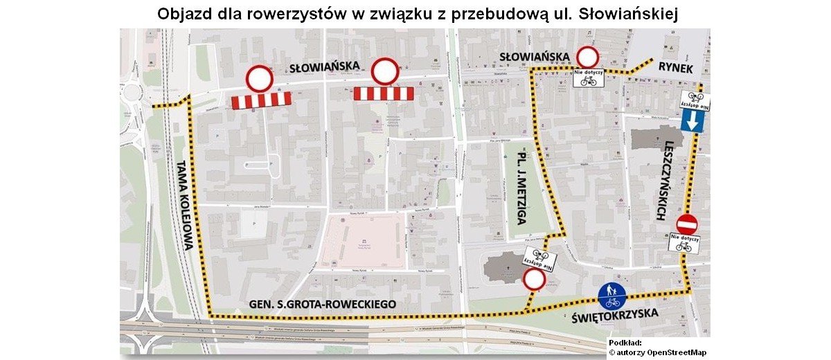 Zakaz ruchu będzie obowiązywał także rowerzystów. Dojazd z Rynku na Zatorze jest możliwy alternatywną trasą przez Pl. Jana Metziga, ul. Świętokrzyską, ul. gen. Stefana Grota-Roweckego i ul. Tama Kolejowa do przejazdu kolejowego. Na czas przebudowy ul. Słowiańskiej zdemontowanych zostało 16 stojaków rowerowych, które powrócą wraz z zakończeniem inwestycji.