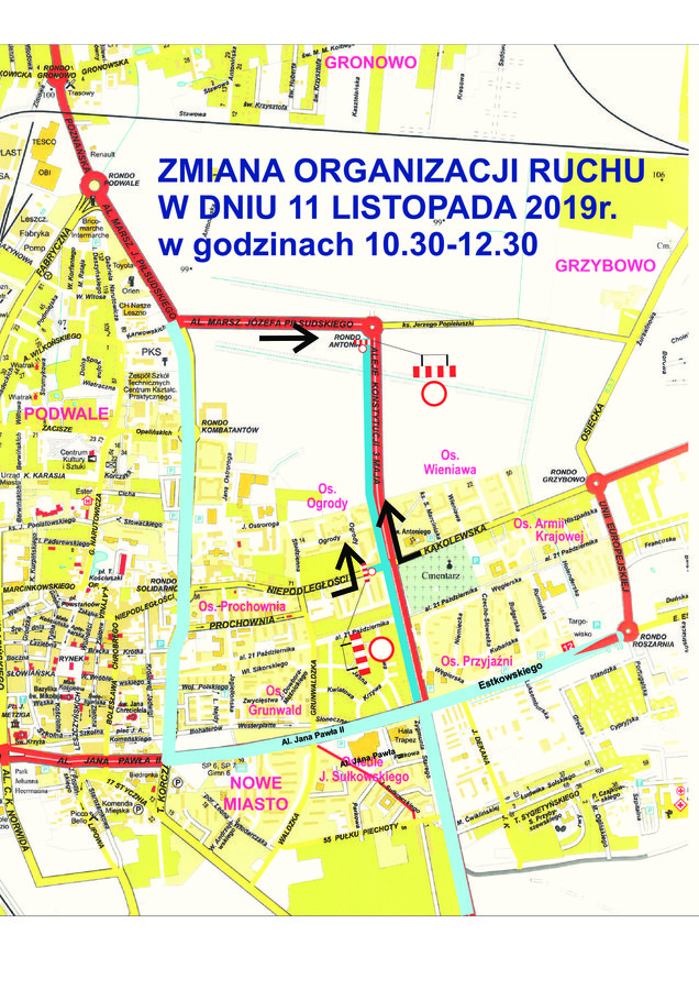 Jak co roku zachodnia nitka drogi wojewódzkiej nr 309 (dawnej drogi krajowej nr 5) zostanie zamknięta na odcinku od Ronda Antoniny do ul. Jana Pawła II. Zamknięty będzie także fragment ul. Niepodległości od ul. Os. Ogrody do Al. Konstytucji 3 Maja (do pomnika). Utrudnienia będą w godzinach 10:30-12:30.