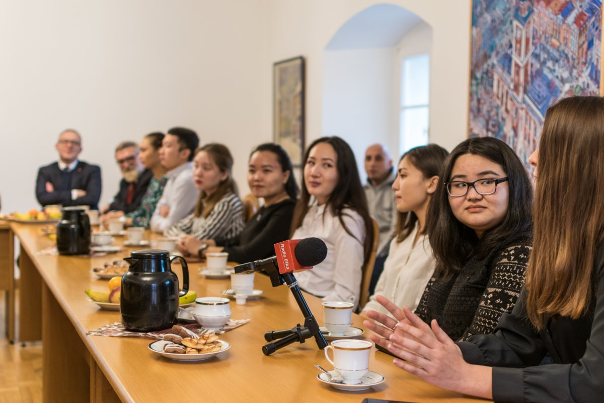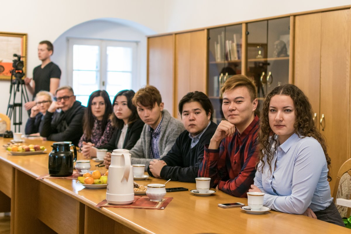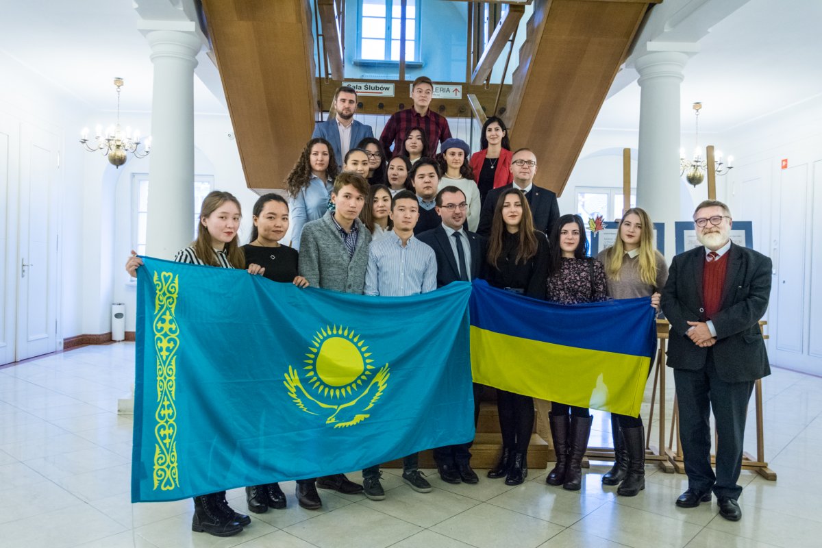 Nie obyło się bez pamiątkowych zdjęć. Studenci podarowali także prezydentowi miasta tiubietiejkę, czyli tradycyjną, kazachską, tkaną czapkę.
