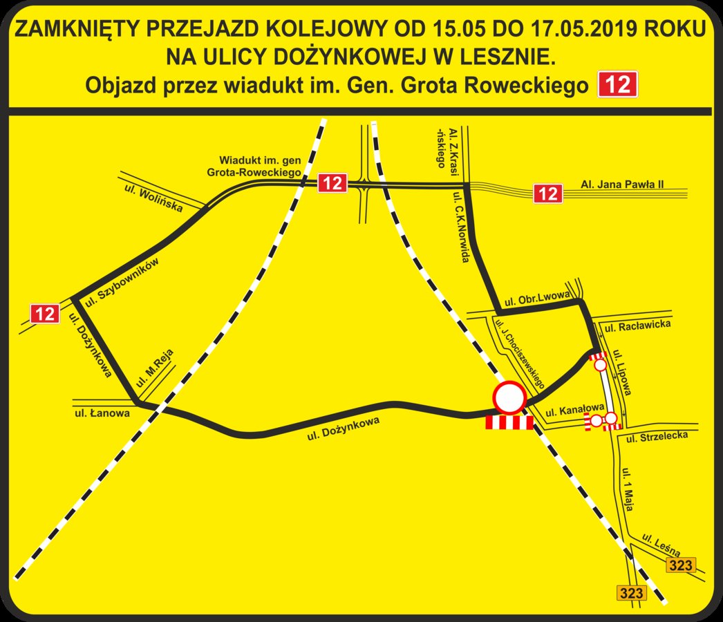 Jak informuje wykonawca robót, ze względu na technologię prowadzonych robót wymagane jest całkowite zamknięcie przejazdu kolejowego dla ruchu pojazdów. Objazd zostanie wyznaczony następująco: ul. Dożynkowa – ul. Szybowników (DK 12) – Wiadukt im. Gen. Grota-Roweckiego (DK12) – ul. C.K.Norwida – ul. Obrońców Lwowa – ul. Lipowa – ul. Dożynkowa.