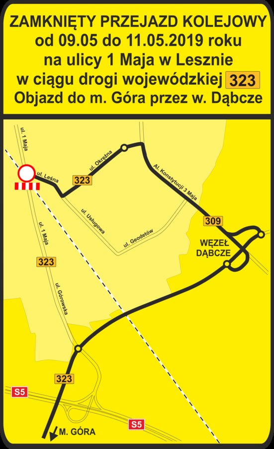 Jak informuje wykonawca robót, ze względu na technologię prowadzonych robót wymagane jest całkowite zamknięcie przejazdu kolejowego dla ruchu pojazdów. Objazd zostanie poprowadzony drogą wojewódzką 323 (ul. Leśną i Okrężną), następnie Al. Konstytucji 3 Maja przez węzeł „Dąbcze” do drogi wojewódzkiej 323 w kierunku Góry.