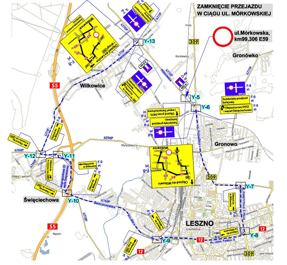 Zgodnie z projektem czasowej organizacji ruchu objazd został wyznaczony drogą wojewódzką 309 (ul. Poznańską, Al. Marszałka Józefa Piłsudskiego, Al. Konstytucji 3 Maja), drogą krajową nr 12 (Al. Jana Pawła II, wiadukt im. gen. Stefana Grota-Roweckiego), dalej ul. Wolińską do drogą łącznikową wzdłuż drogi S5 oraz trasą prowadzącą do Wilkowic