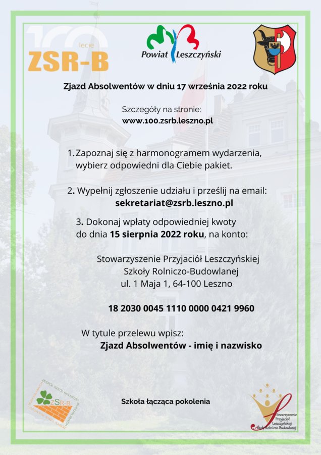 Na Zjazd Absolwentów, planowany na 17 września br., zaproszona jest cała społeczność szkoły: dawni i obecni uczniowie, pedagodzy i pracownicy szkoły oraz przyjaciele i sympatycy popularnego "Rolnika". Ma to być wyjątkowe święto i jednocześnie podsumowanie Jubileuszu 100-lecia istnienia Zespołu Szkół Rolniczo-Budowlanych w Lesznie.