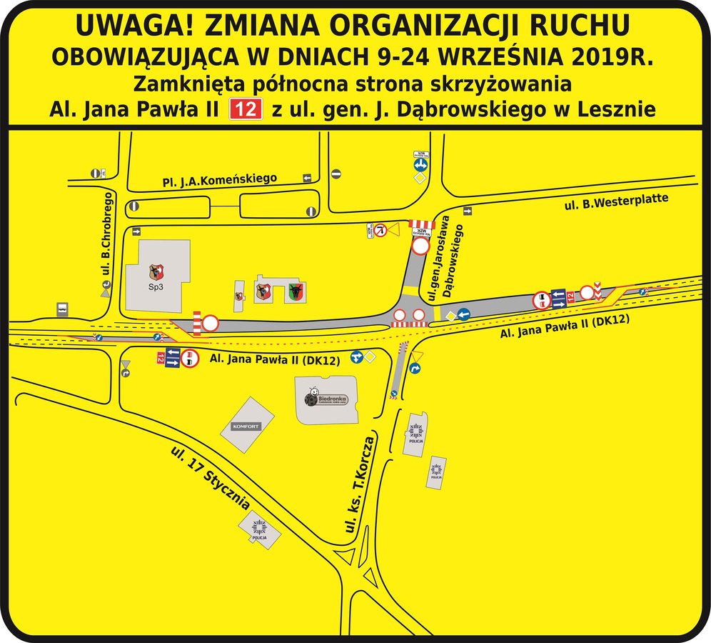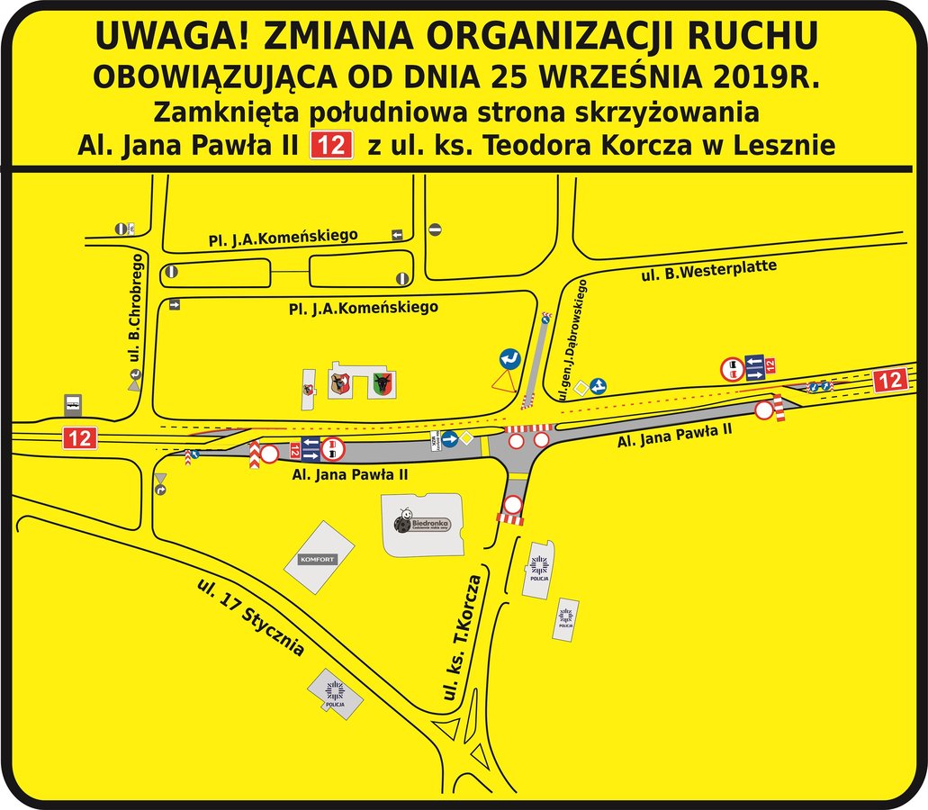 W związku z koniecznością wykonania robót związanych z układaniem warstwy ścieralnej jezdni Al. Jana Pawła II w nocy z 24 na 25 września zmieni się organizacja ruchu na skrzyżowaniu z ul. gen. J. Dąbrowskiego i ks. T. Korcza. w Lesznie.