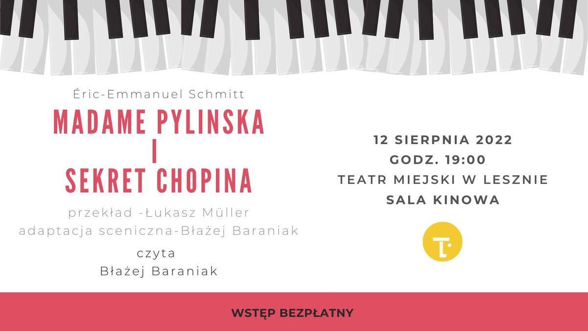 godz. 19.00, Teatr Miejski w Lesznie, Madame Pylinska i Sekret Chopina czyta Błażej Baraniak; więcej informacji znajdziesz na: https://leszno.pl/_Madame_Pylinska_i_Sekret_Chopina_czyta_Blazej_Baraniak.html